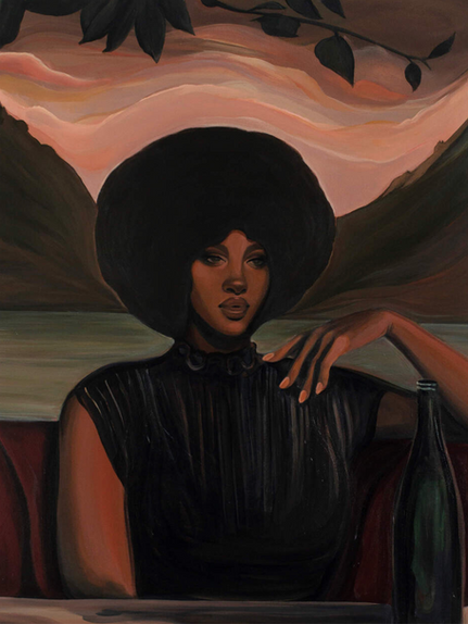 Megan Gabrielle Harris, is a Afro-American multi-disciplinary artist of Nigerian descent. Megan's acrylic paintings are heavily influenced by travel, surreal landscapes, and nature, often featuring women of colour depicted as powerful, regal, and divine against vibrant backdrops. Rooted in the traditions of afro-escapism and surrealism, Gabrielle Harris explores dreamscapes and the concept of escape, drawing inspiration from her father, Thomas Harris, who painted in the Escapism style. Her art celebrates rest, leisure, and the beauty of nature, using edenic elements to communicate the sacredness and divinity of the natural world. In this serene, paradisiacal setting, her muses embody heightened versions of themselves, feminine, fragile, and free.