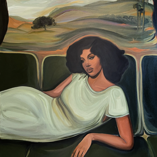 Megan Gabrielle Harris, a multi-disciplinary artist of Nigerian and African American heritage, creates striking works in drawing, painting, and photography. Her art is deeply influenced by travel, surreal landscapes, and nature, often portraying women of colour as regal, divine figures set against vibrant backdrops. Rooted in afro-escapism and surrealism, Harris explores the concept of escape, drawing inspiration from her father, Thomas Harris, who painted in the Escapism style.